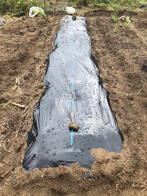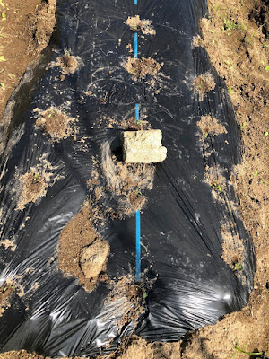 | まずは手前1/3のマルチに小さな穴を開けルッコラを植えた。 |