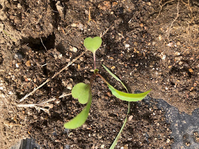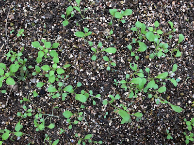 | それにしてもワイルドルッコラは種も小さかったが、出てくる芽も小さい。 それでも3年目の種からでも芽が出てきたのにはひと安心だ。 |