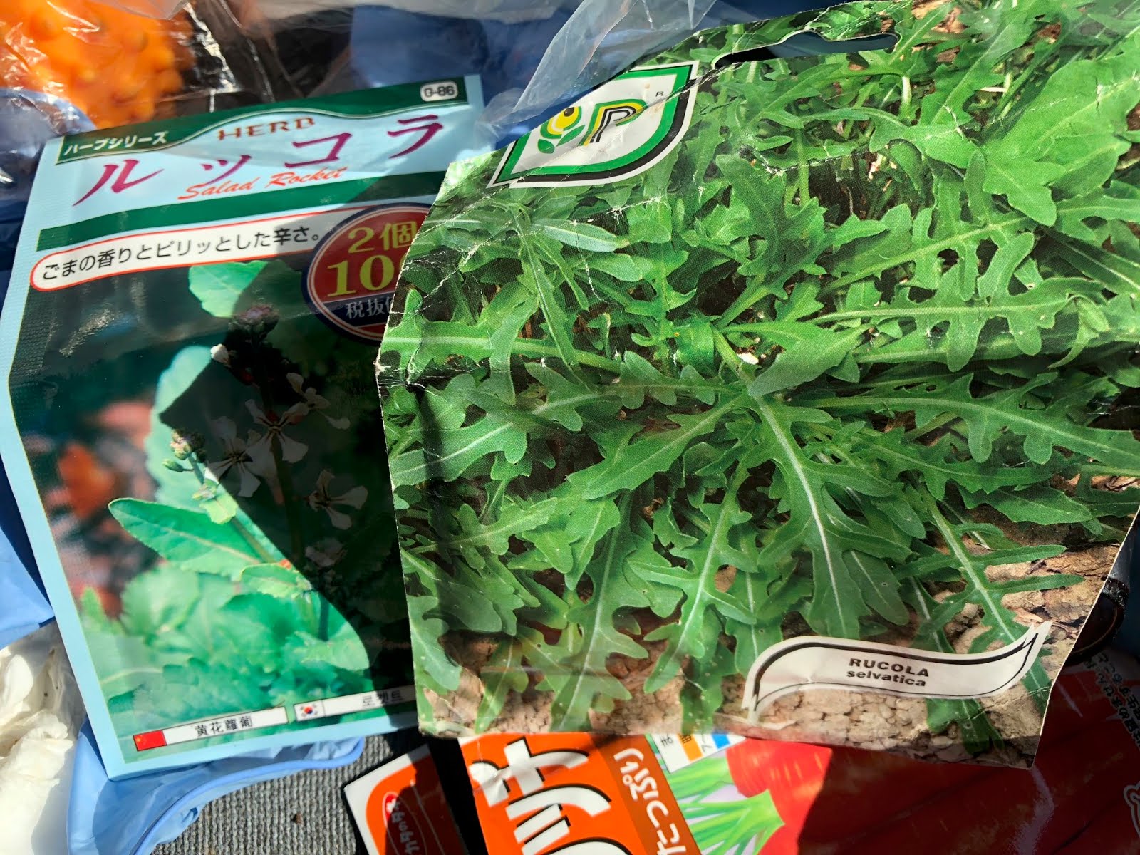 ルッコラの種は自家採種と100円ショップの種があったが、ワイルドルッコラの方は3年目の種で、残りも少なくなっていたので今回の種まきで全てを使い切った。