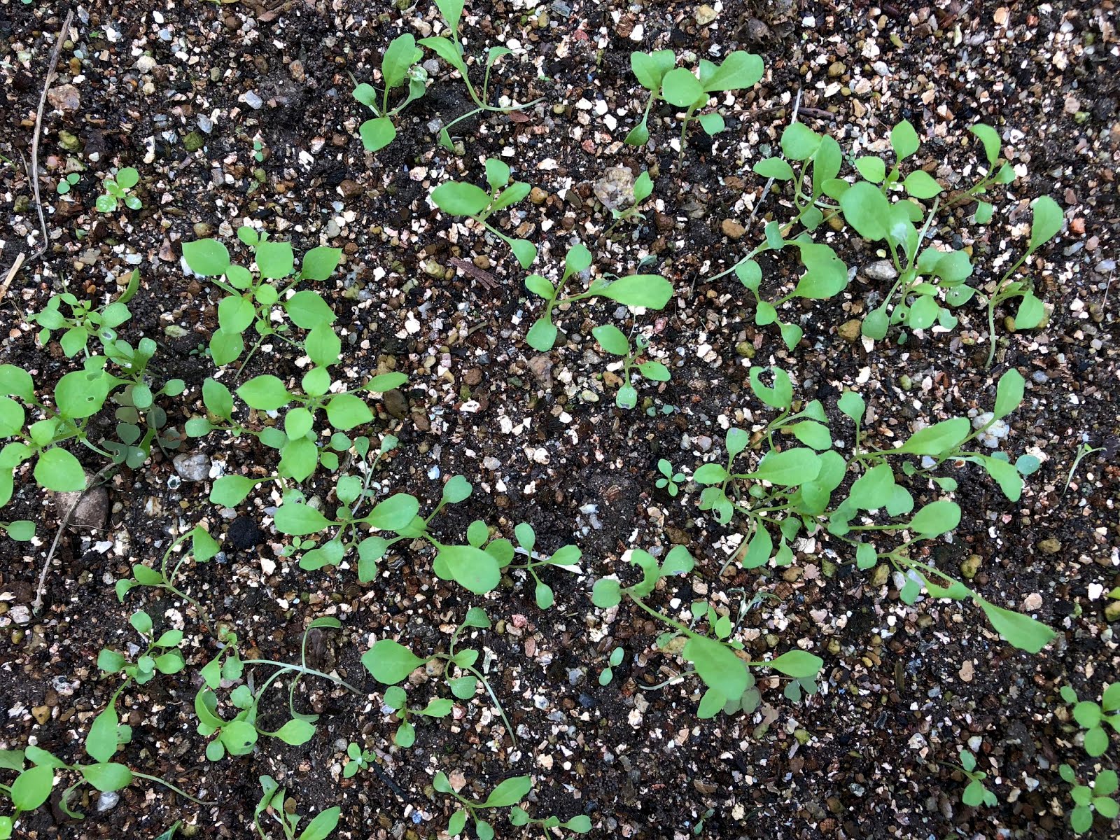 | それにしてもワイルドルッコラは種も小さかったが、出てくる芽も小さい。 それでも3年目の種からでも芽が出てきたのにはひと安心だ。 |