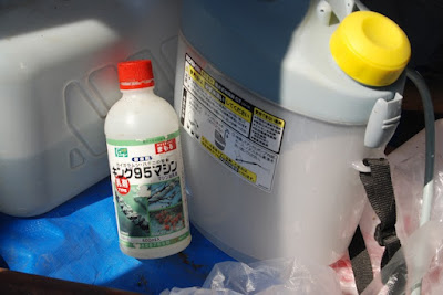 で、今日は全てのミカン類の木にマシン油とスミチオンを散布した。