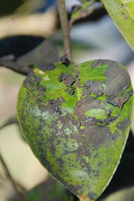 しかし、この八朔の木、よく見ると所々にスス病の被害が見られる。