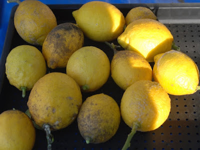 | こちらは、今日最終収穫したレモン。 綺麗なレモンもあるが、スス病に侵されて表面が黒くなったものもある。 |