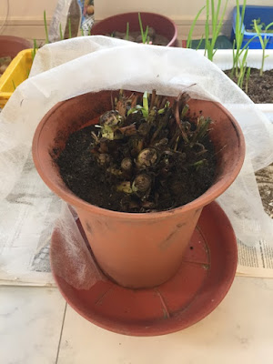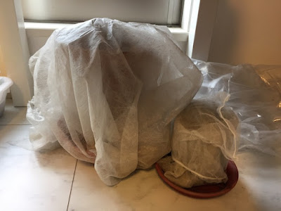 さらに、予備に小さなポットにも小さな株を移植して、同じように不織布で包み、室内に置いておいた。