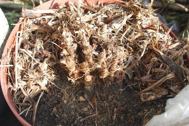 | 茎元にもうす緑色はなくなり、新芽も出ていない。どうやら越冬失敗だ。 |