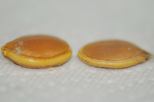 | 右は以前種取りをした、えびすカボチャの種。かなり厚さが違う。 左のロロンカボチャの種が厚いのがよくわかる。 |