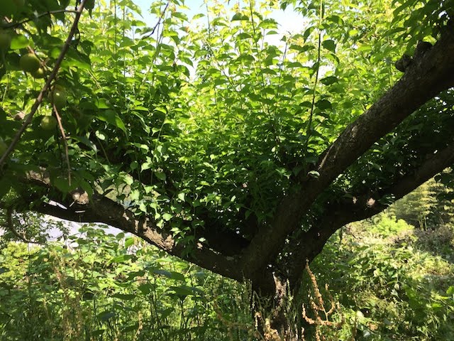 さて、ワイルドストロベリーを見に行ったついでに、収穫前の梅の木の下見をしてきた。