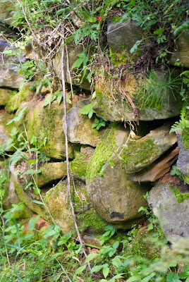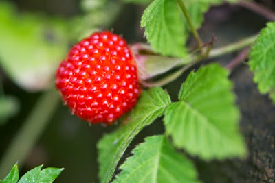 | 石垣の上の方に野イチゴはあった。 下の方にはワイルドストロベリーが植えてある。 |