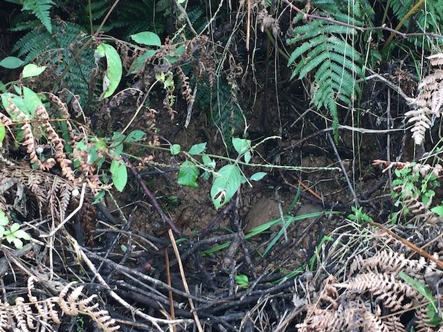 すぐ3mほど離れた所には、イノシシが掘った、大きさが1m、深さ50cmほどの穴があった。