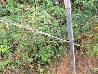 同じ苗木が、今度はイノシシにやられたみたいで、根こそぎ抜けて倒れていた。