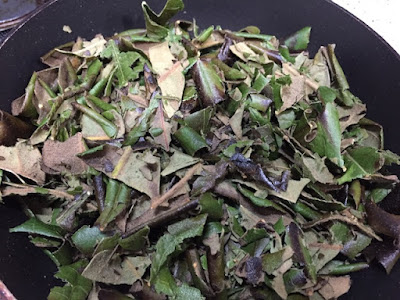 | 今回、フライパンの上で炒っているビワの葉。 オリーブの葉でオリーブの葉のようにいい香りはしない。 それでも、ほうじ茶風の香りがしている。 |