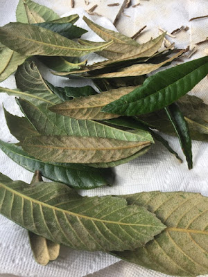| こちらは昨年1月に作ったビワの葉茶。 湯がいて、天日干しにしたところ。 天日干しだと、カラカラになるのに1週間はかかる。 |