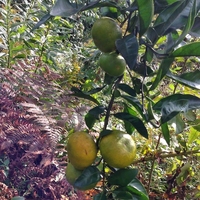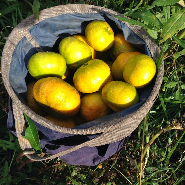 | 最後にこんな感じの青いミカンが少し残っている。 少ないと思ってこれらをそのまま残しておくとサルに枝ごとおられてしまう。 |