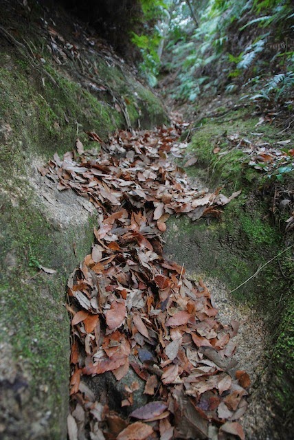 | そっくりの感じの道が叶岳や、十坊(トンボ)山にもある。 松浦辺りにも砂岩を削った岩で作った橋や建物がある。 この辺りは砂岩で出来た山が多いのだろうか? |