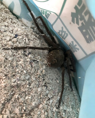 こちらは菜園や果樹園のジョロウグモがかなり姿を消している中、ミミズ小屋を管理している場所に出会った『アシダカグモ』。