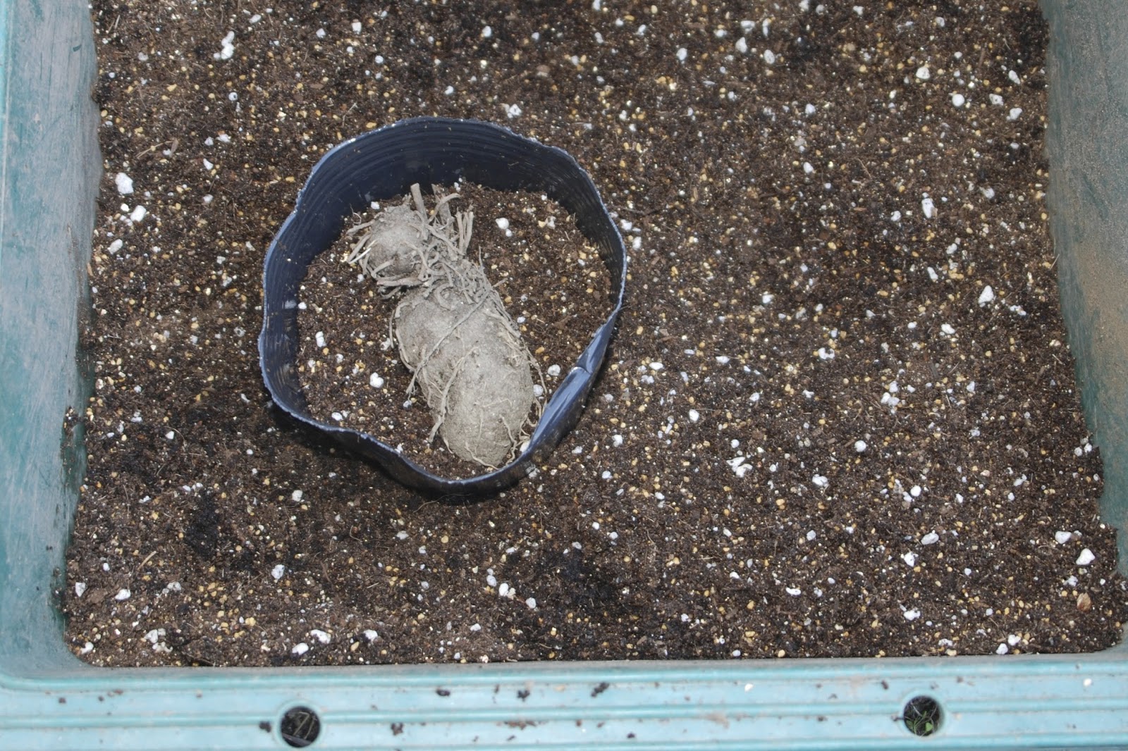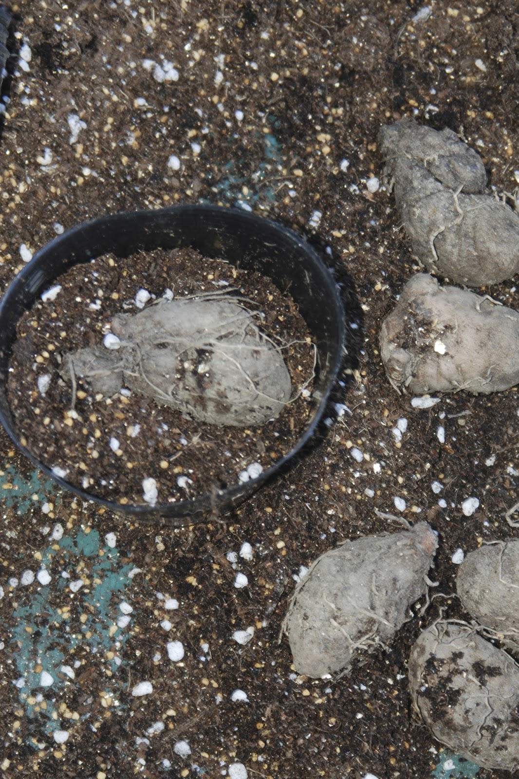 | 昨年までの種芋では、ほとんどがこの12cmのポットには入りきれなかっただろう。 去年は収穫したツクネ芋も小さいものが多かったが、種芋として残した芋も小さかった。 |