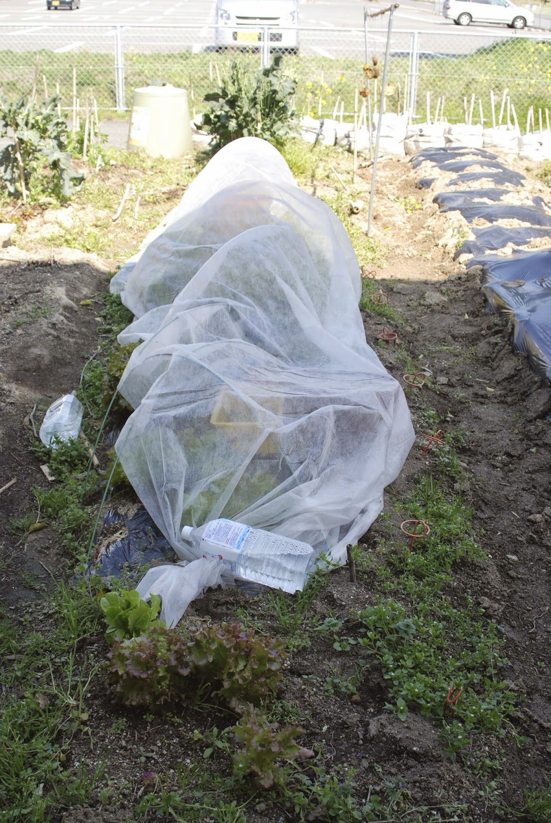 | ここに見える1列がツクネ芋の畝を作る予定地だ。去年より若干広くなりそうだ。 このパオパオの中にはまだ食べきれていないサニーレタスがいっぱいある。 それらの整理が終わってから本格的な畝作りが始まる。まだしばらく時間が要りそうだ。 ところで、この畝には通常の土と栄養の少ない山の赤土の2種類を使おうと思っている。 |