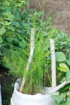 我が家のアスパラ、今年種を蒔いたものが、第1菜園の土嚢袋の中でそれなりに成長している。