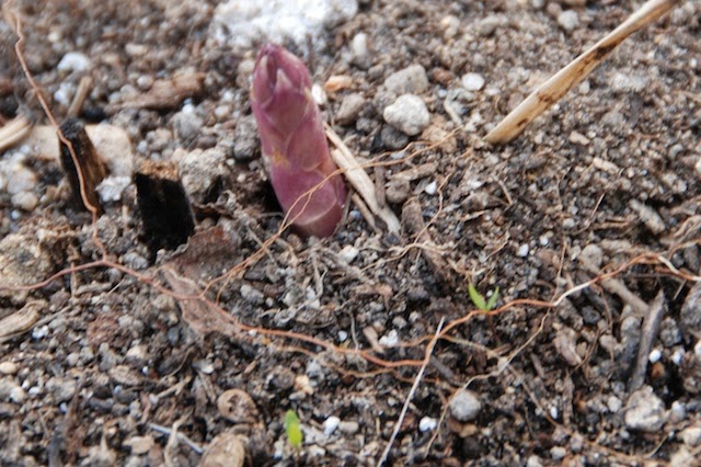 | 春の訪れを感じさせるアスパラ第一号の芽出しは、いつも感激する。 この後一斉に芽が出てくるかと期待したが、ボチボチといった感じだった。 |