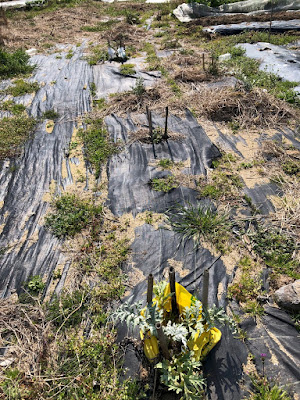 | これら、第2菜園の多くの株にも防虫ネットをかけていた。 しかし昨年秋、アブラムシに対し全く効果がなかったので取り外した。 その代わり、雑草マルチを多くの株に施した。 |
