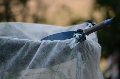 | 不織布を突き破った支柱がモズ君の止まり木になった。 |