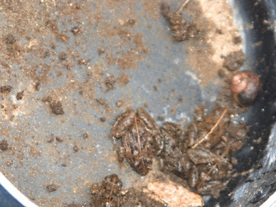 | 私が側に居るので、鍋の中で食べるのが不安? カエルはどこかに持ち出した。 |
