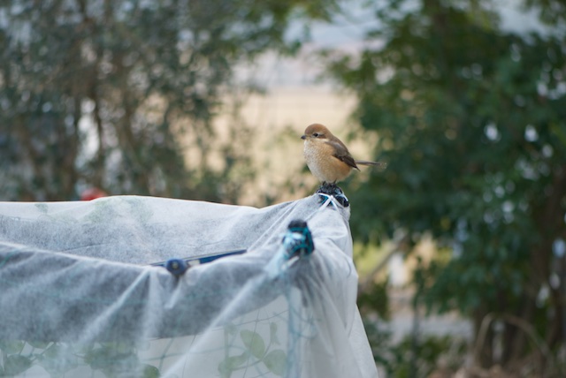 | 不織布を突き破った支柱がモズ君の止まり木になった。 |