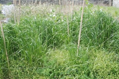 | こちらは第2菜園の苗。 雑草の間に豆の苗がチラホラ見えていると言った感じだ。 これでは豆の苗が元気に育つとは考え難い。 |