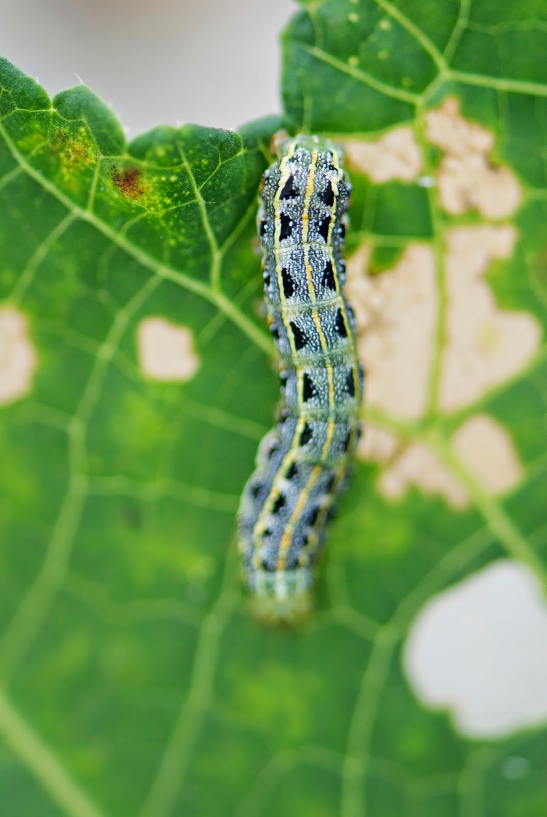 | これは去年のオクラの葉。7〜8月によく見かけたハスモンヨトウの幼虫だ。 この幼虫はオクラ、ナス、里芋など畑のほとんどの野菜に取り付いていた。 葉脈や葉柄を残して暴食するので苗1本丸坊主にされたものもあった。 |