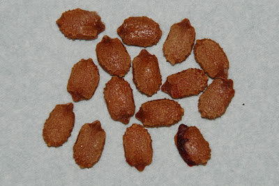 | 真っ赤なゼリー様のものを外すと、茶色に引き締まった立派な種があった。 早くも来年の種蒔き用の種が揃った感じだ。 |