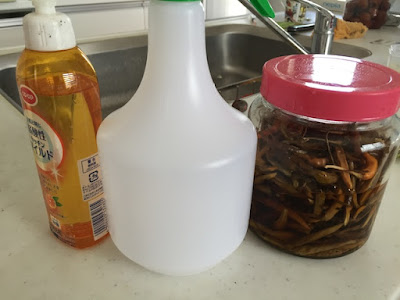 | これまでトウガラシスプレーに使っていた500ml容器が壊れた。 で、今回は1000mlスプレーを用意した。 内容は、トウガラシ焼酎溶液+少量の洗剤+水 だ |