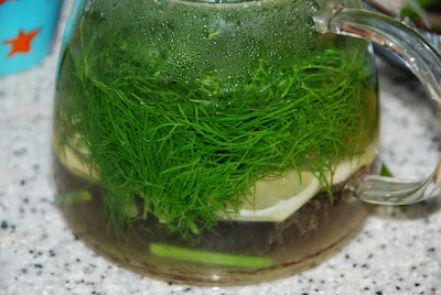 | レモン1個をスライスして、今日採ってきたフェンネルを全てティーポットに入れた。 後は熱いお湯を注いで出来上がりだ。 |