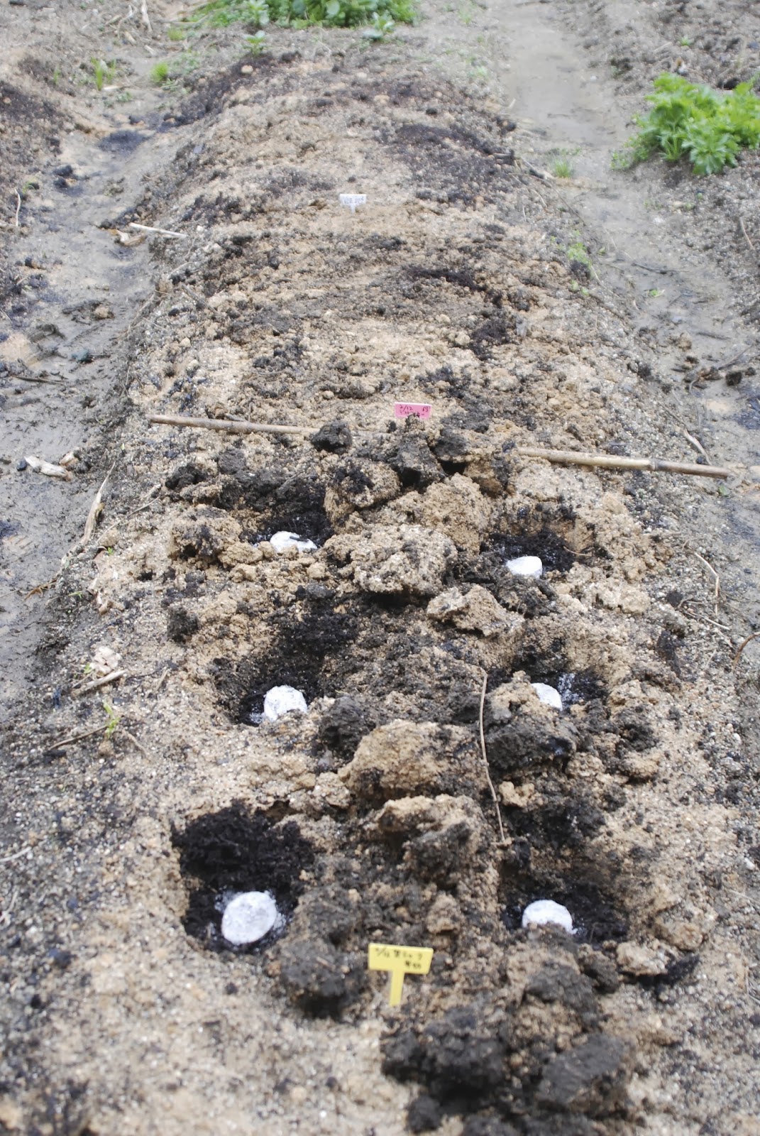 | こちらの畝がいつもより一足先に種芋を植えた畝。 奥から、アンデス赤、デストロイヤー、男爵芋の順に植えている。 |