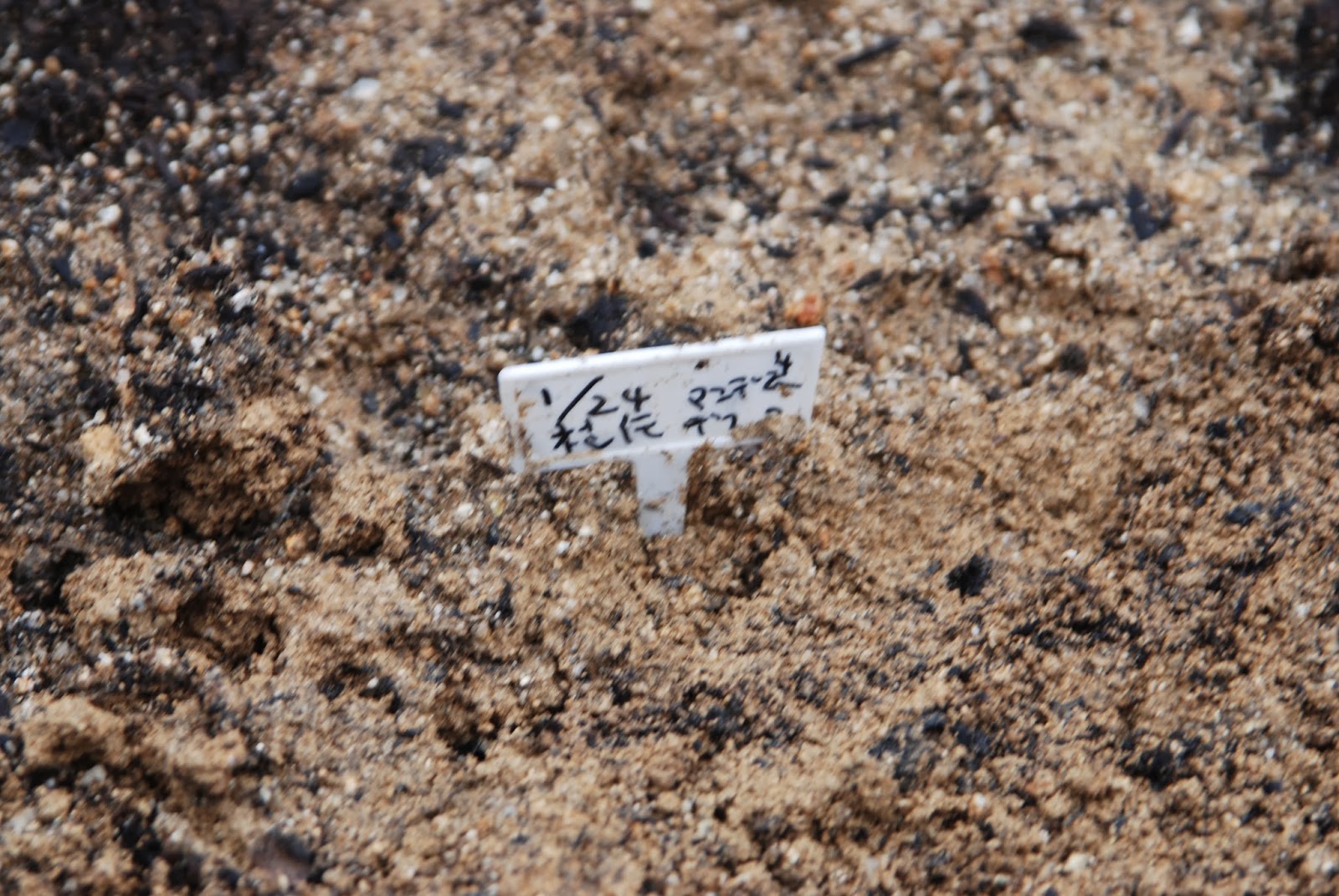 | こちらが、1/24に植えたアンデス赤。まだ地上に芽は出てきていない。 ガーデニング専用ペン(?)で書いたので、以前のようにプレートの字は消えていない。 |