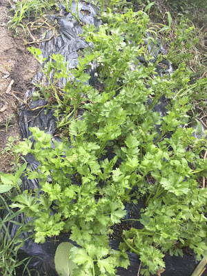 | 8月の終わりには収穫できるセロリも茎が硬くなり始めた。 葉の方も焼けた感じで傷んだものが増えてきた。 やはり種まきが、通常より早かったのが原因だろう。 |
