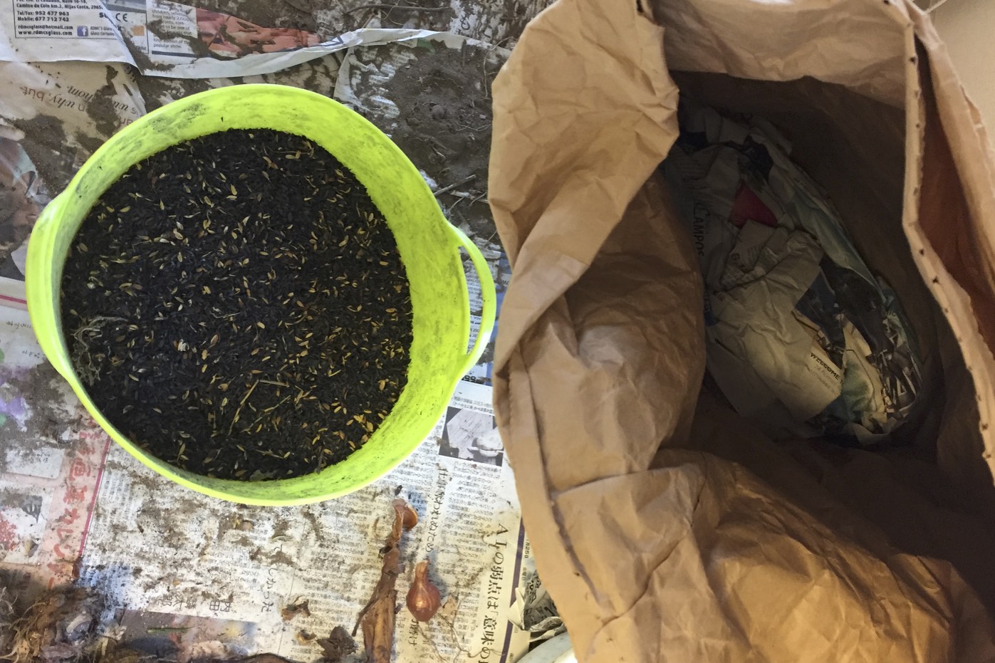 米袋の中だけでなく、籾殻の中でも今年は芋が乾燥しないように簡単に新聞紙で包んだ。