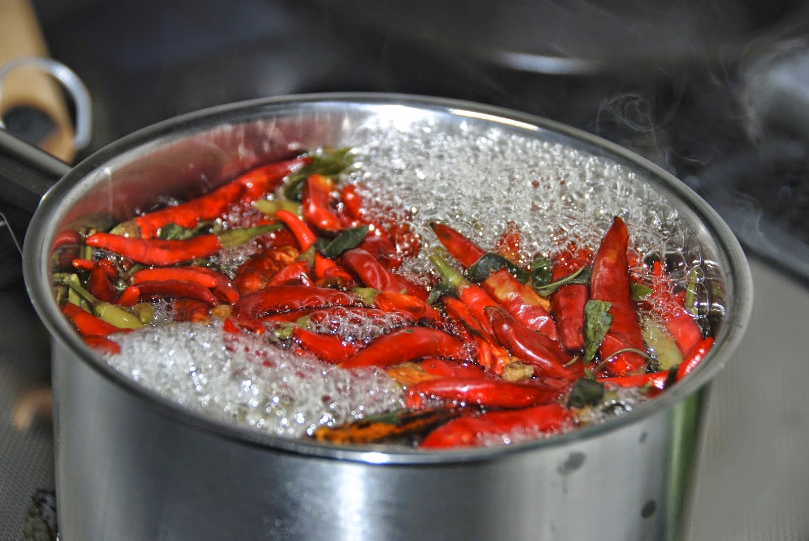 昨年作ったトウガラシスプレーは収穫して使い切れなかった真っ赤なトウガラシを沸騰させた湯でその成分を抽出した。