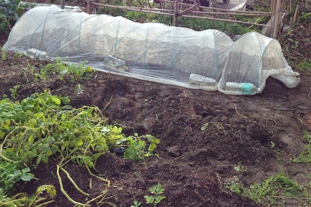 先日サツマイモを収穫した畝をちょっと耕し、ミミズ堆肥をたっぷり入れて、そこにパオパオを掛けた。冬の時期にかかせないパオパオを掛けての野菜作り第1弾だ。
