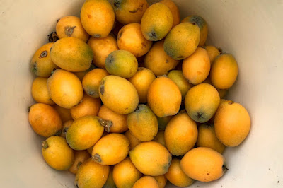 | こちらは昨日の写真。 一気に色づき始めたビワの実。 |