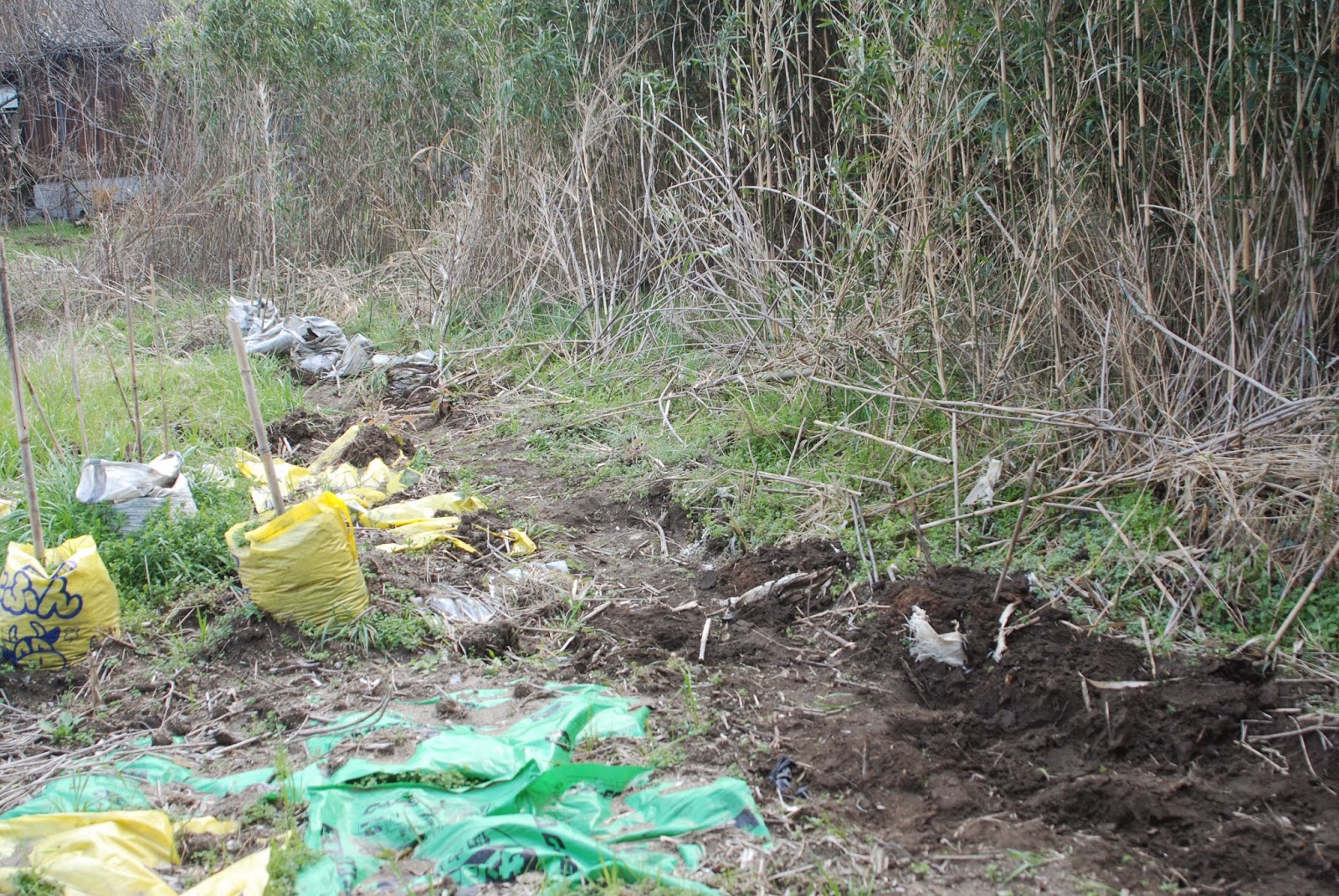 去年は、笹竹の侵入を防ぐために深い溝を掘って、そこに土嚢袋を置きた。
