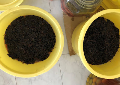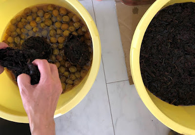 今年も、塩もみが終わって絞ったソフトボール大の紫蘇ボールを、2個の樽にほぐしながら入れていった。