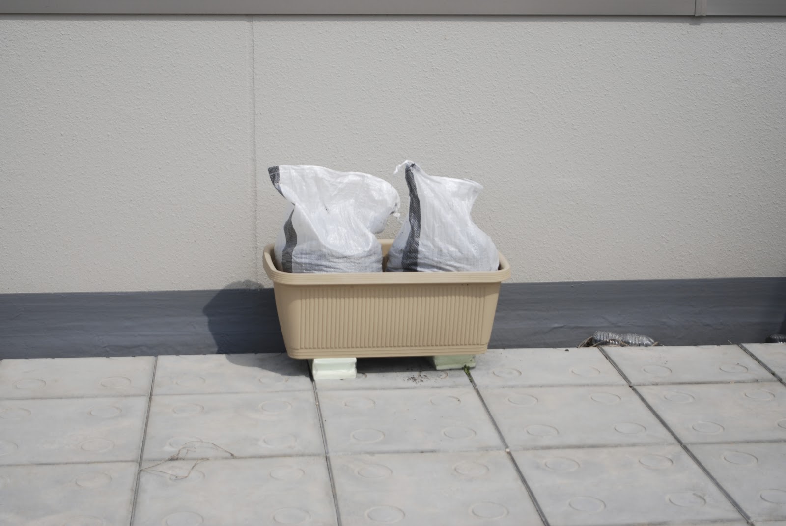 プランターより一つの苗に対する土の量が増えるし、土嚢袋をプランターの中に置くことでコンクリートの熱の影響が少なくなると思われる。