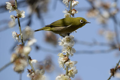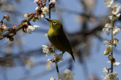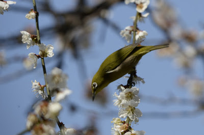 果樹園では、そろそろ終わりに近づいている大梅の花に、まだ名残惜しそうにメジロ君がいっぱい遊びに来ていた。