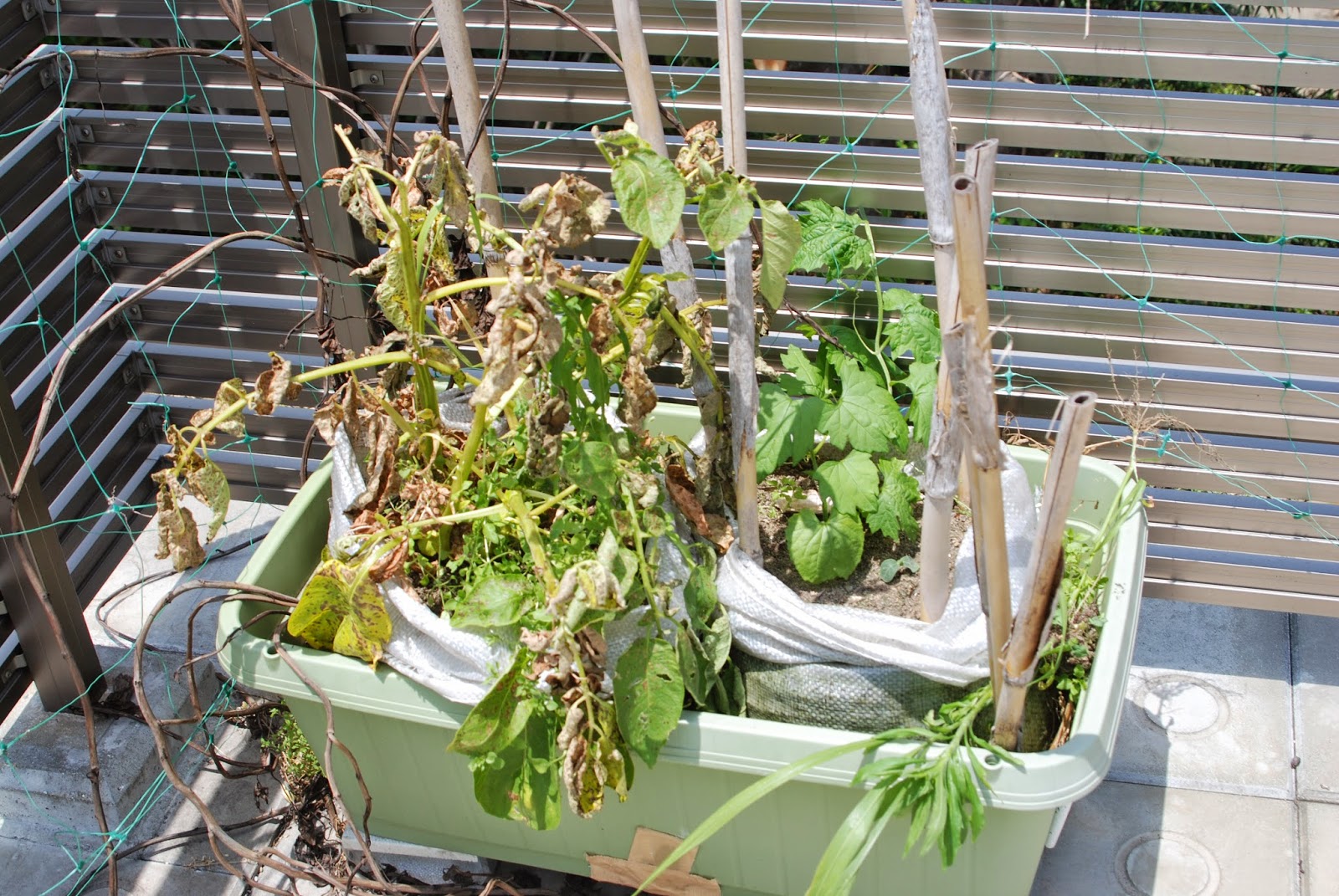 屋上菜園のジャガイモはほとんどが男爵芋だ。その状態は土嚢袋によってマチマチ。