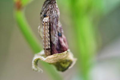 | 居たのは花ガラ。夏にオクラの葉に見かけたものと色が違う。 一瞬、ハスモンヨトウも擬態化するのかと思っても見たが恐らく違うだろう。 |