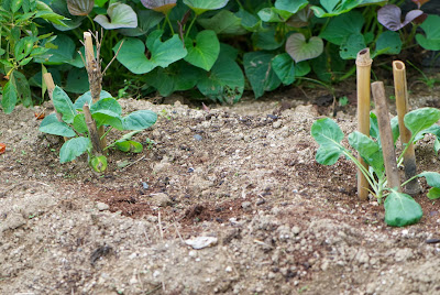 今年は、畝に3本、土嚢袋に2本芽キャベツを植えてみた。