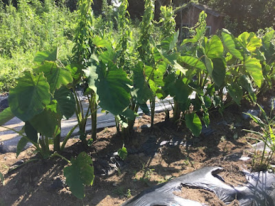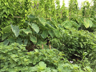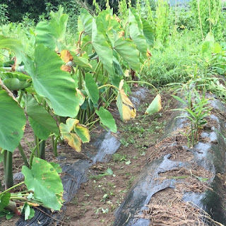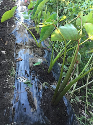 そして、もう1箇所うまくいっていると思える畝は、先日草抜きをした、第2菜園の里芋(赤芽大吉)だ。