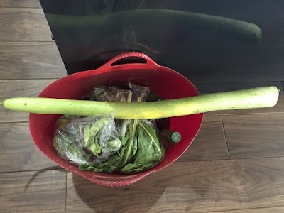 | 食用に収穫して帰っている若干若めの長いズッキーニ。 |