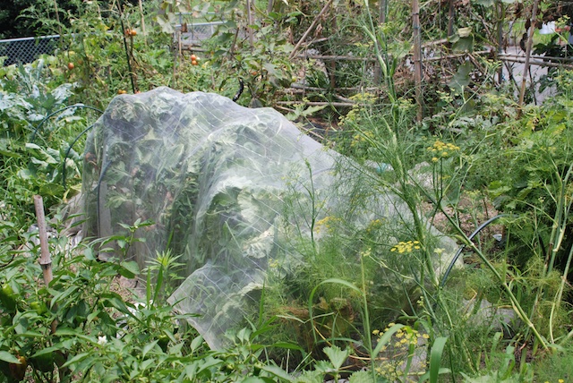 そこで、今年はネット管理を厳重にして下の写真のようにして育てたので、種袋に載っているようなスペインキャベツが出来るかと思ったが、そうはいかなかった。
