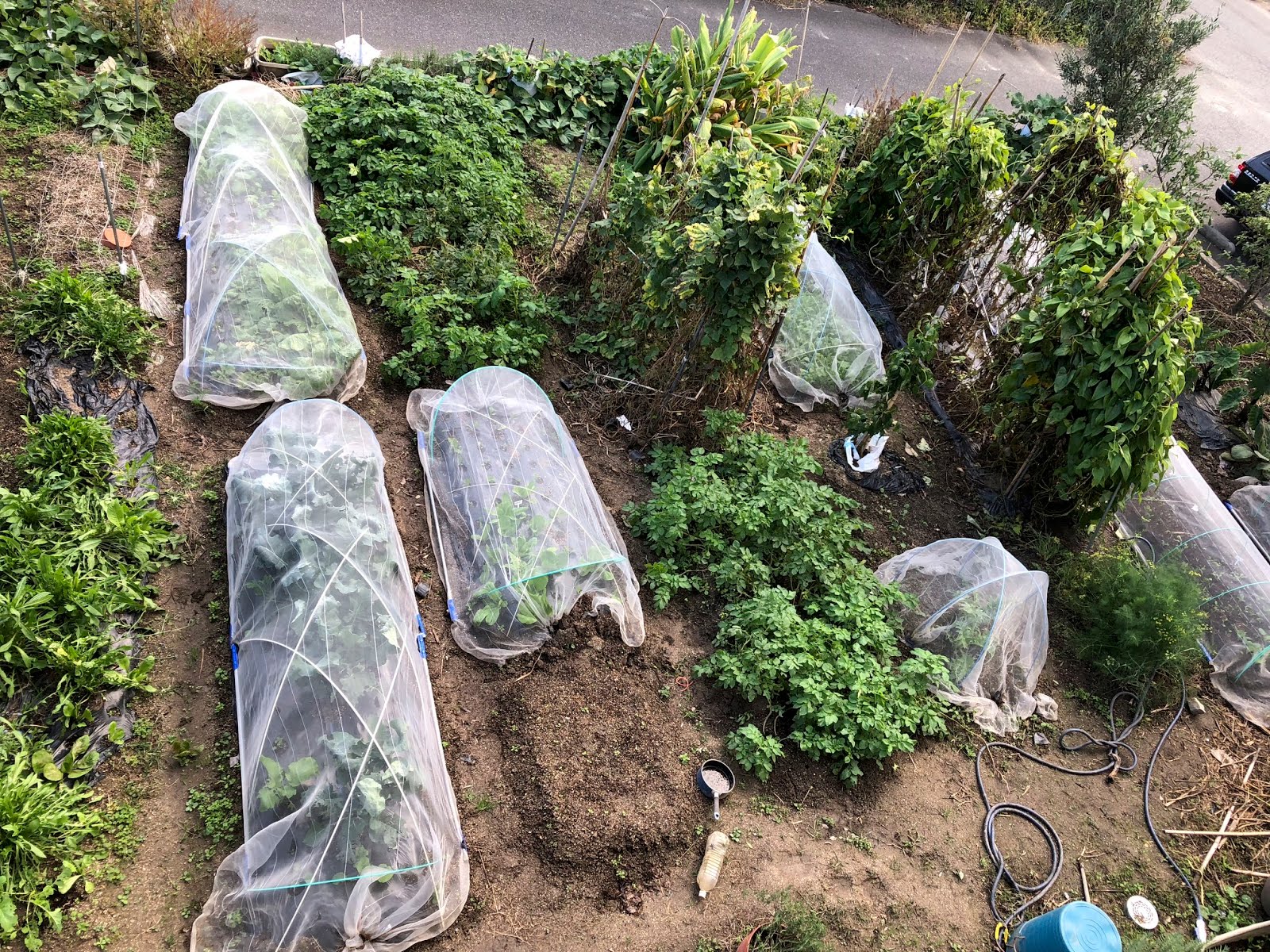 | こちらは、一昨年の天井まで取り付けた厳重な対策。 その前の年に、暴風と寒さ(雪)で苗が枯れて収穫できなかったのでこうなった。 この時の雪よけに天井部分は、苗が伸びた2月に外した。 |
